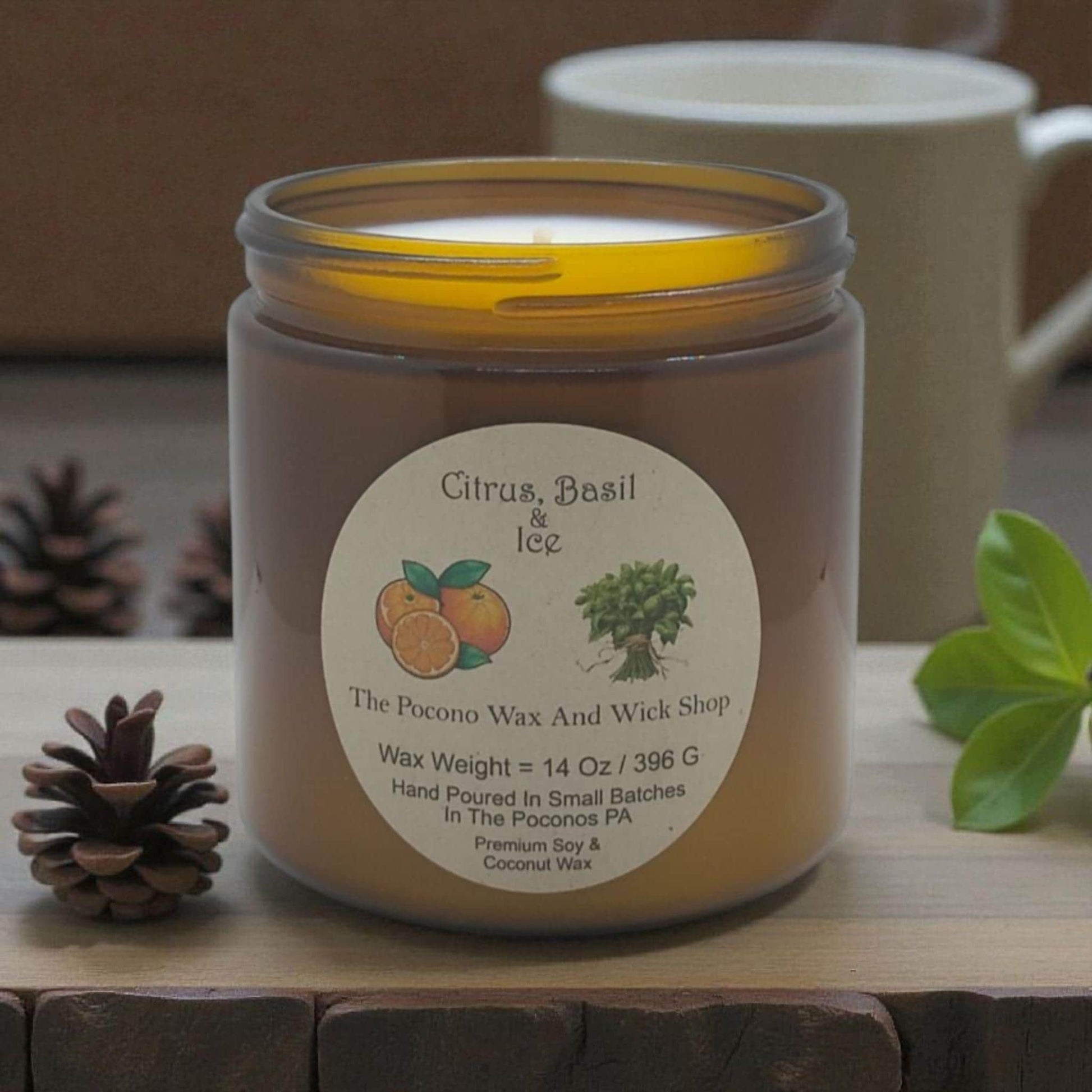 This candle is a Citrus & Basil scented candle in an Amber Glass using premium soy wax and fragrance oils. This candle has a wax volume of 14 oz by wax weight. All of our glass jars, round tins and wax melts are hand poured in very small batches here in the Poconos, PA using premium soy wax and fragrance oils.