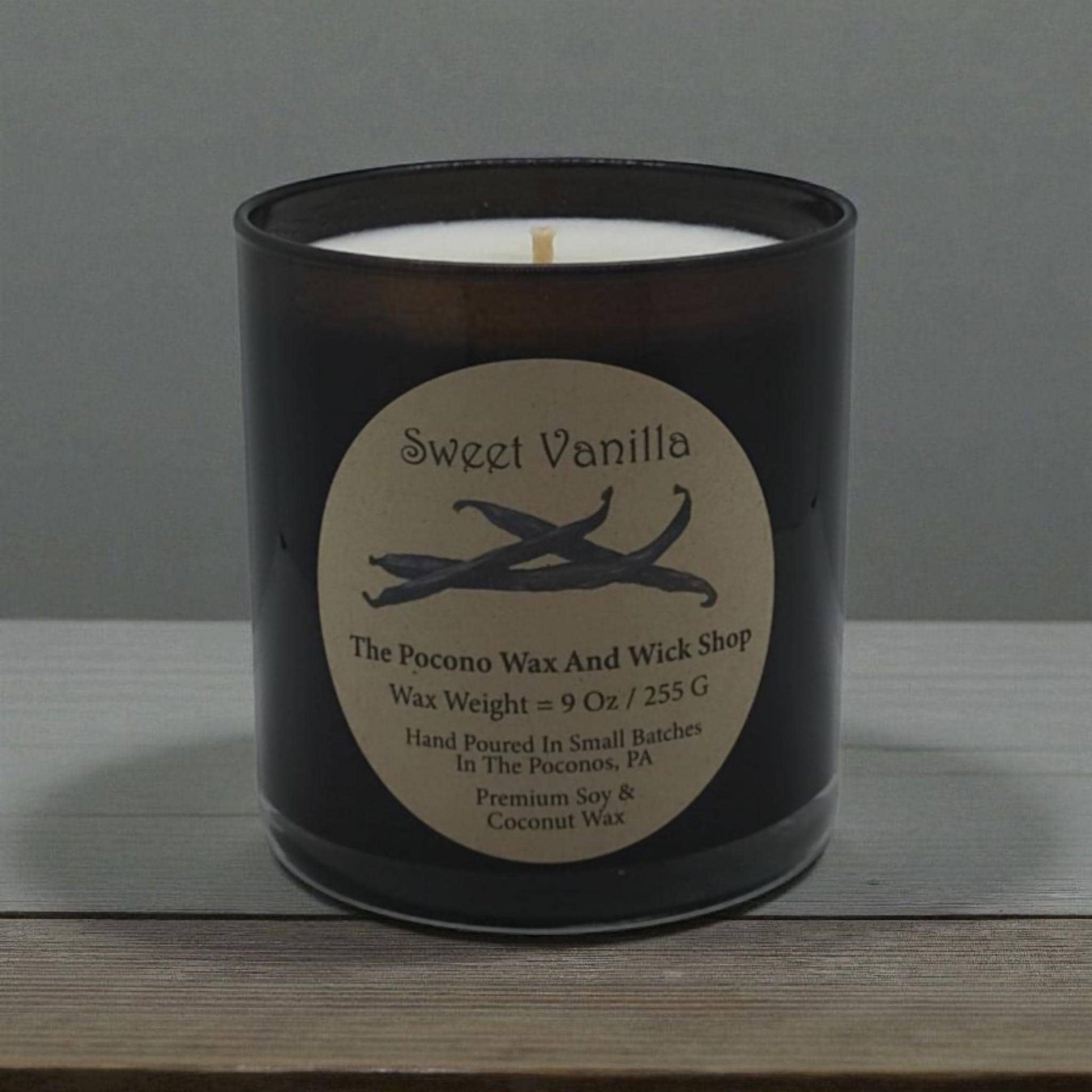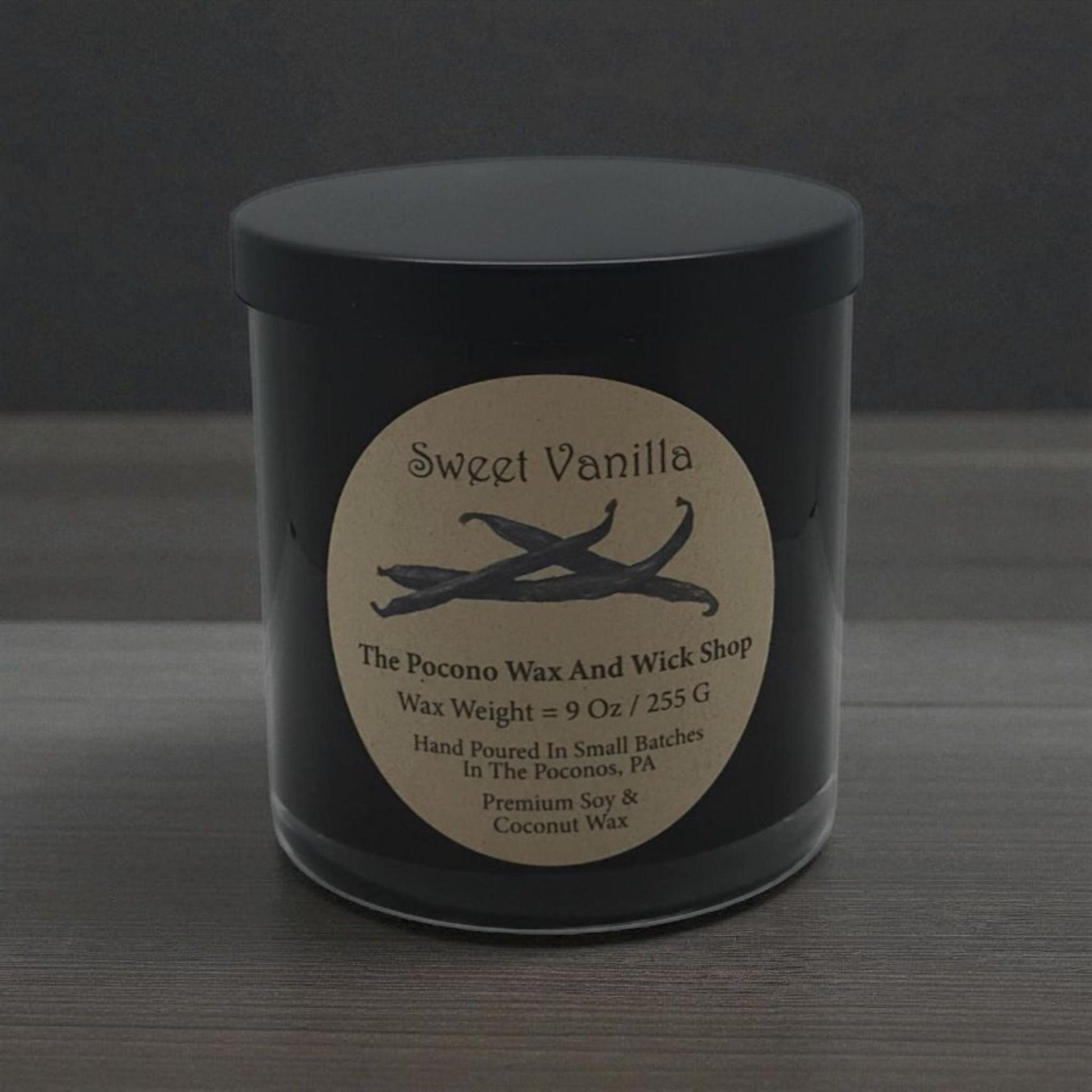 This candle is a Sweet Vanilla scented candle in a Shiny Black Glass Tumbler using premium soy wax and fragrance oils. This candle has a wax volume of 9 oz by wax weight. All of our glass jars, round tins and wax melts are hand poured in very small batches here in the Poconos, PA using premium soy wax and fragrance oils.